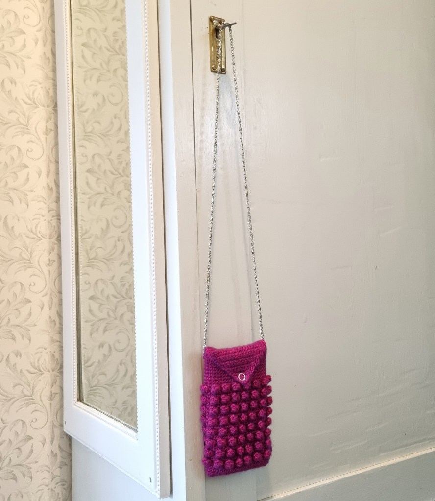 This summer I made my sef a phone bag. In the summer when not having a jacket or trousers/jeans with pockets it´s nice to have somewhere to put the phone. I love popcorn stitches, so I made a phone bag with popcorn stitches. Now I´m going to share the pattern with you if you want to make a bag like this. I used Scheepjes riverwashed 942 Steenbras. You are also going to need a chain to use as a handle and a snap.