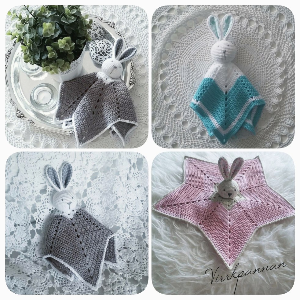 Under rubriken "OM" finns info om vad som gäller för mina mönster. Garn: Nova, sunkissed, bambino. Garnerna kan du beställa fraktfritt med blixtsnabb leverans från http://www.favoritgarner.se Mönstret till stjärnfilten hittar du HÄR under mitt rymdsnuttemönster. Använd virknål nr 3,5 till filten så blir den lagom mjuk och gosig. Kaninhuvud Huvudet virkar jag med virknål nr… Fortsätt läsa Kaninsnutte ”securityblanket rabbit”
